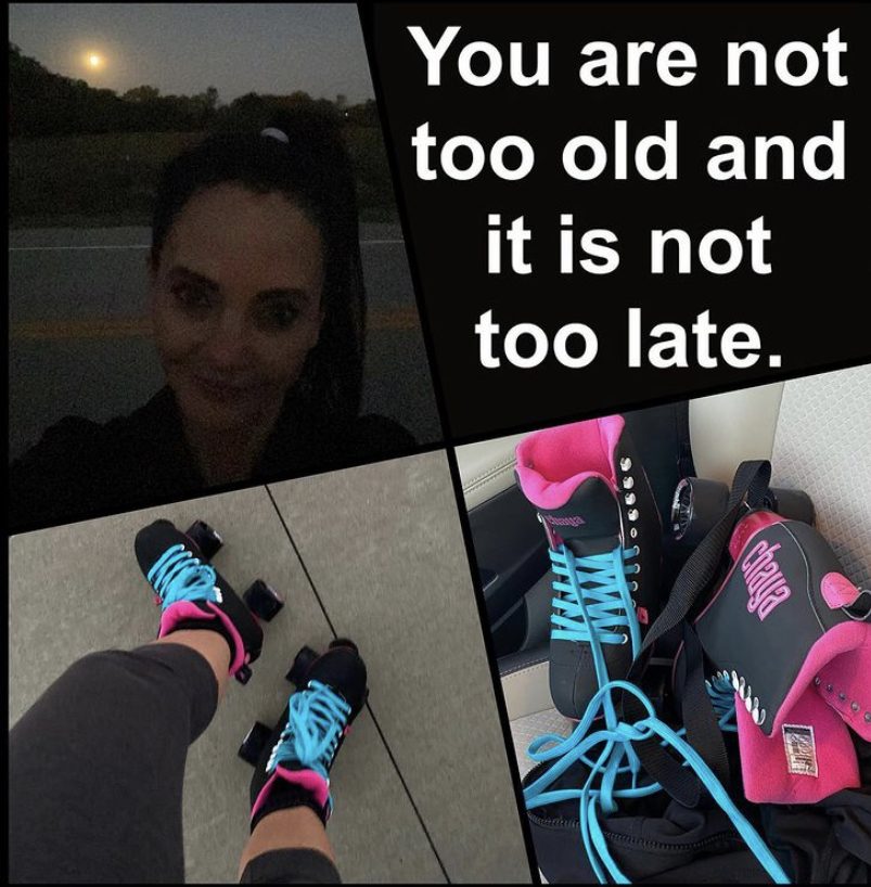 I began ice-skating last year and roller-skating outside this year. It has honestly been the BEST VIBE for my soul. I feel free for a time. Free of being almost 47 years old and all the responsibilities that can weigh me down being an adult. Skating takes me back to a place of feeling the wind in my hair and nothing but an awesome peace vibe. Plus, it kicks ass to be really good at something and just keep getting better at my age. My kids dig me. I’m pretty lucky in the sense that they are proud of me and whatever crazy as hell thing I decide to start “doing”. Occasionally then even get on board!